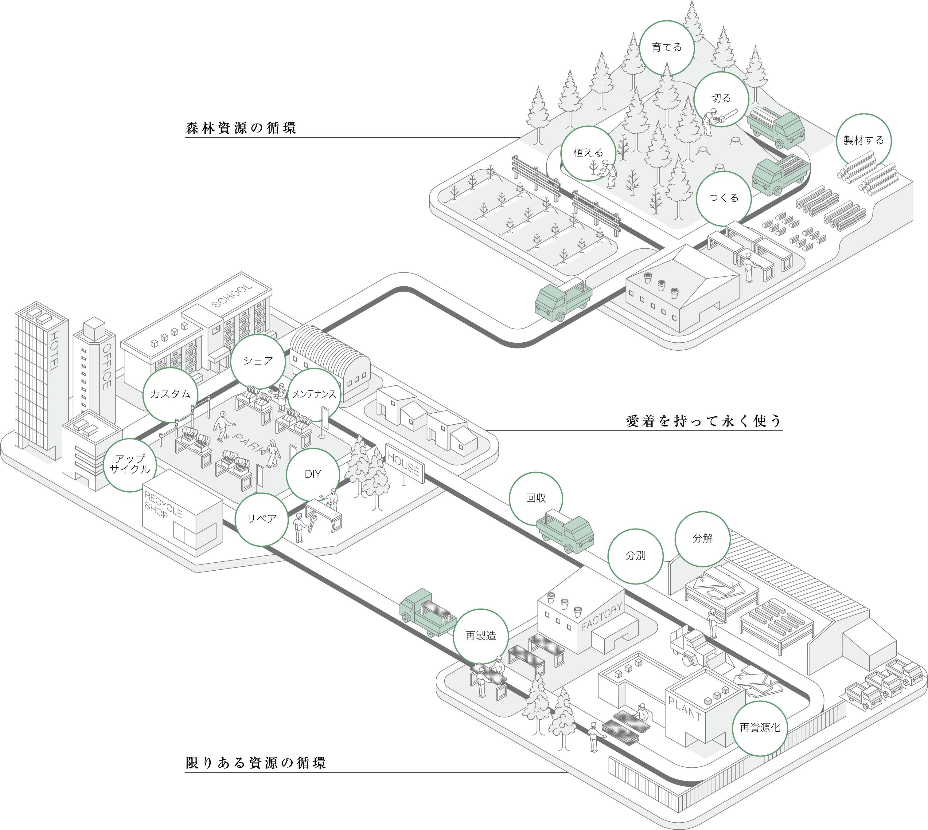 再生可能な素材で商品をつくること。やがて役目を終えた商品もゴミにすることなく、資源としてリユース・リサイクルすること。そんなあたりまえな循環を、私たちと一緒につくっていきませんか?