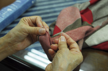An expert knitter carefully picks up a stitch dropped by the knitting machine.