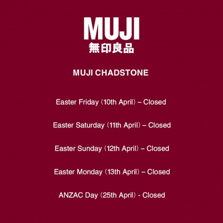 EASTER TRADING HOURS – To help you plan your trips to our stores, please note our trading hours over the Easter break. MUJI Australia wishes you and your family a Happy Easter! Please look after your loved ones, stay healthy and safe. ⠀⠀
