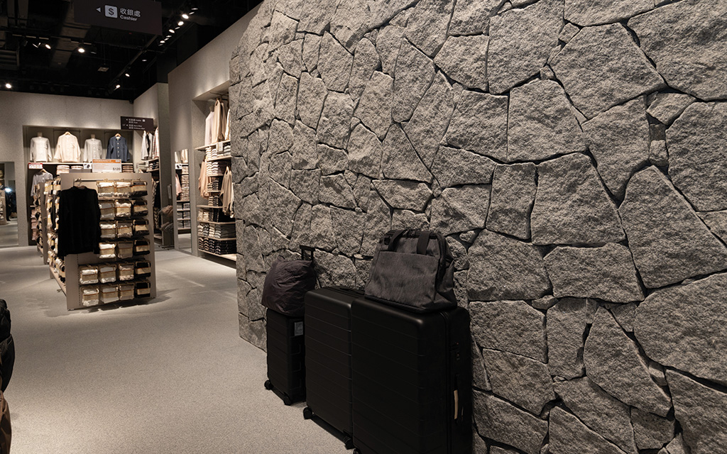 新店以「自然與現代生活共生」為設計主題,希望透過富素材感的店內空間演繹及商品展示,以可視化的方式傳遞無印良品傳承至今的「自然簡樸、不作多餘裝飾」理念。店舖設有兩層,下層選用木材、石材、鐵材等大自然素材,透過展現其原始面貌以至加工處理後的形態,讓顧客重新感受日常生活中各種物件之原點—自然,以及探索其可能性;上層則以人造工業素材如金屬板、鋼管等融合大自然素材,拼湊成新的質感,配合開放式天花設計,為店內空間帶來耳目一新的氣氛,務求以有別於以往的方式呈現無印良品的自然觀。