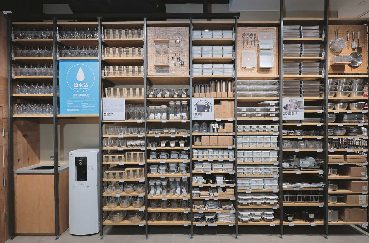 以關顧環境為理念,無印良品AIRSIDE店設有「給水站」,提供免費飲用水供應。顧客只需要自備水樽,便能夠隨時補充水分;同時店內亦設有多款水樽供選購,透過減少使用即棄膠樽,從日常生活培養環保習慣,實踐綠色生活。