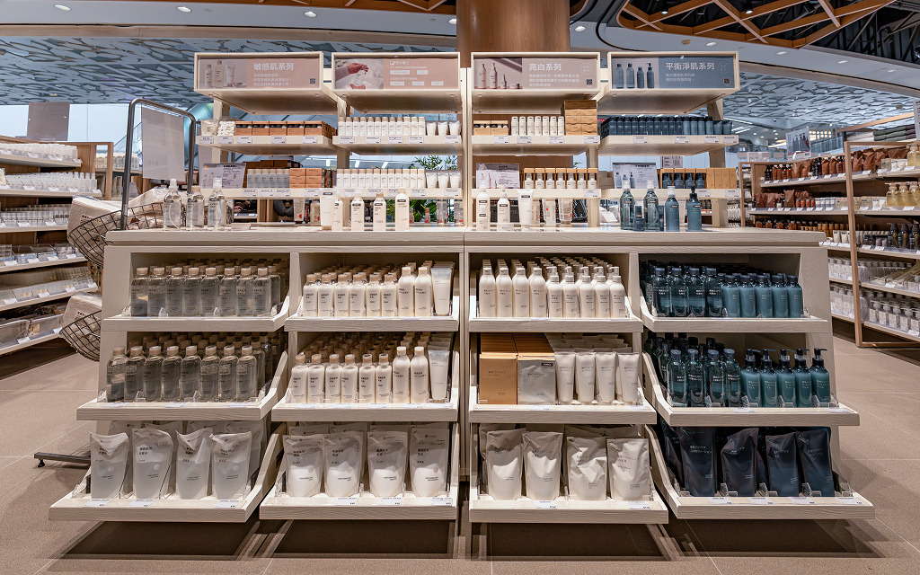 新店設計簡潔,強調自然和可持續的生活理念。店內採用再生材搭配木紋邊緣,展現石材的樸實美感,並配搭天然木質家具,呈現出自然純樸、簡單及可持續性的生活理念。設計巧妙地利用大型天幕將自然光線充分引進室內,揉合柔和燈光,搭配明亮溫潤的天然及再造物料,勾劃出一個讓人悠然自在的舒適購物空間,讓顧客在購物同時,也能感受到與自然和諧共存的靜謐氛圍。