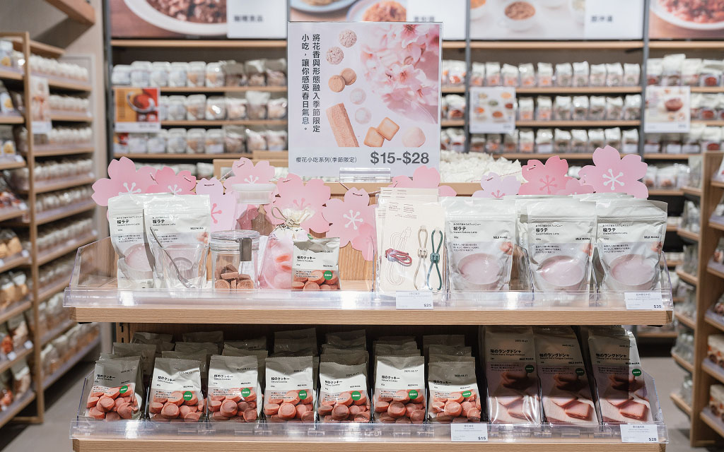 當你踏入無印良品新都城中心店,會感受到整間店舖散發出的溫暖舒適感。天花懸掛着環保古木大木方配合白色木屑壓縮板,帶領顧客穿梭每一個空間。服飾區則選用米灰色調木皮,配合特別訂製的環保碎木方造成展示平台,為該區帶來既自然又時尚的感覺。古木條造成的小屋屋頂,將美容護理區及女裝區連接起來。穿過小屋將會進入家品家具區,該區域用上暖灰色環保物料木屑壓縮板為設計,為顧客帶來全新感覺,提供更舒適的購物空間。無印良品新都城中心店的推介商品包括全新精油香薰護理系列,以及春季限定 — 櫻花食品系列,將櫻花香與形態融入季節限定食品如千層蛋糕、糯米糍、貓舌餅及即沖櫻花牛奶等,口感細膩,讓大家感受春日氣息。