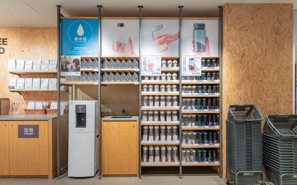 無印良品太古城中心店於店舖增設「給水站」,提供免費飲用水。顧客只需要自備水樽,便能夠隨時補充水分;同時店內亦設有多款水樽以供選購。透過減少使用即棄膠樽,從日常生活培養環保習慣。店內同時增設「COFFEE STAND」自助精品咖啡機服務,選用香港本地咖啡烘焙廠新鮮烘焙的精品咖啡豆,即時研磨製作多種冷熱飲品,散發醇郁芳香。