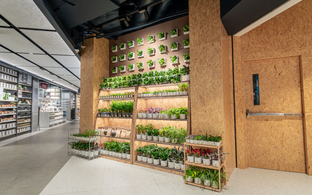 新店以可視化的方式傳遞無印良品傳承至今的「自然簡樸」理念,店舖裝修採用環保及回收素材佈置,例如以回收膠樽物料重塑的透明膠板、環保地磚物料製成的地板及環保木材製貨架等,透過素材的加工處理,探索大自然與現代共生的可能性,形成店內獨特的氛圍與質感,以質樸的空間環境,提倡環保概念,同時與購物體驗完美結合。