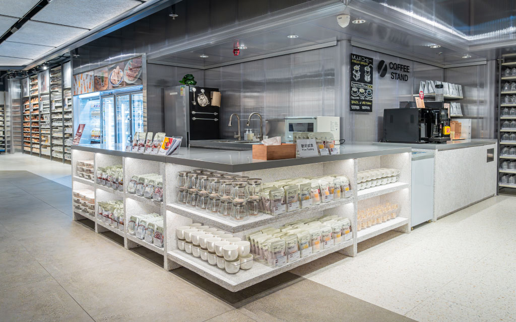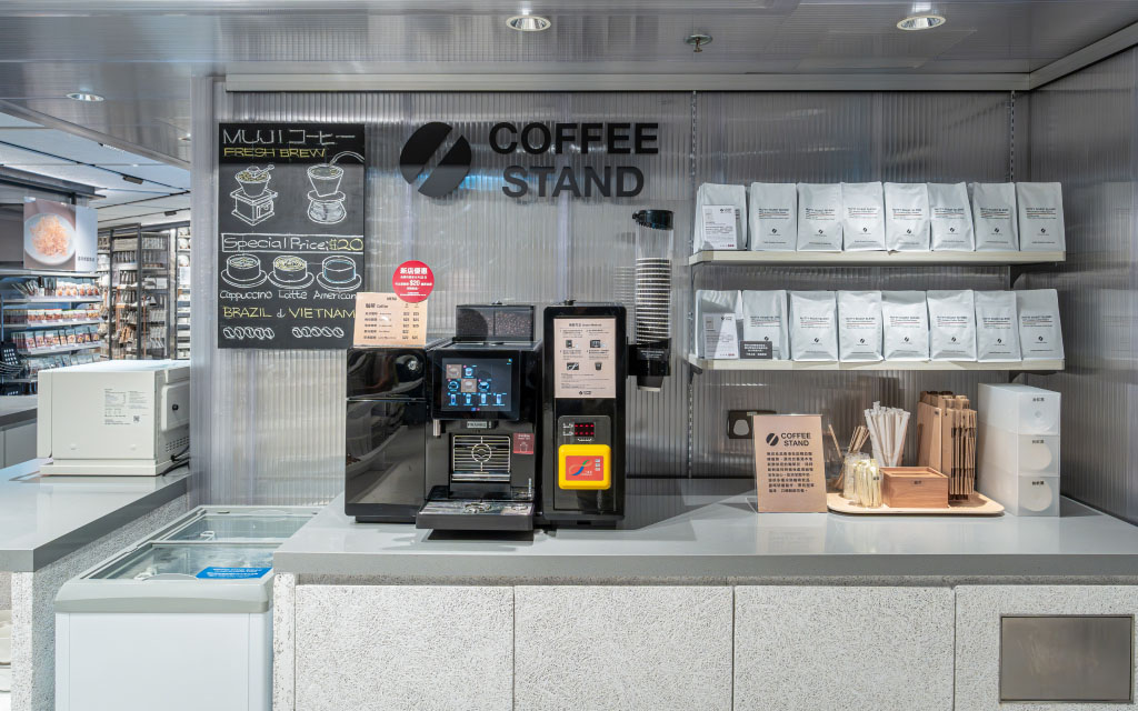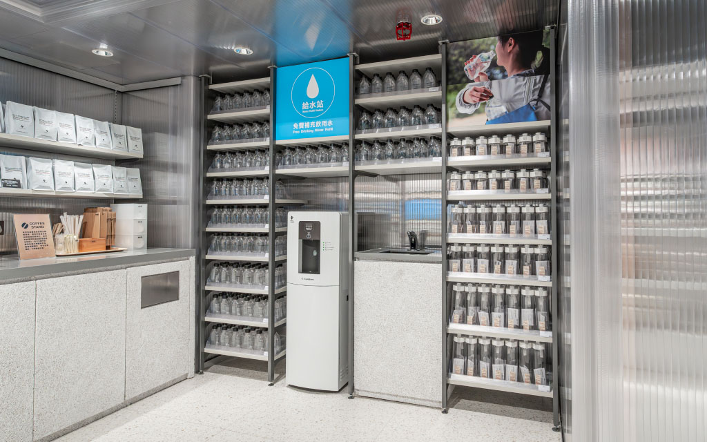 無印良品美麗華廣場店於店舖增設「給水站」,提供免費飲用水。顧客只需要自備水樽,便能夠隨時補充水分;同時店內亦設有多款水樽以供選購。透過減少使用即棄膠樽,從日常生活培養環保習慣。店內同時增設「COFFEE STAND」自助精品咖啡機服務,選用香港本地咖啡烘焙廠新鮮烘焙的精品咖啡豆,即時研磨製作多種冷熱飲品,散發醇郁芳香。