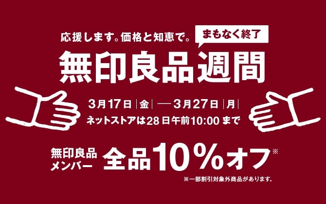 【まもなく終了】期間:2023年3月17日(金)~3月27日(月) ※ネットストアは3月28日(火)午前10時まで 2023年3月17日(金)から3月27日(月)まで、無印良品メンバーの みなさんに感謝を届ける『無印良品週間』を開催中。 期間中、店舗では MUJI passportの提示で10%オフ、 ネットストアでのお買い物も10%オフです。 対象者:無印良品メンバー MUJI Card会員・MUJI.netメンバー・MUJI passport会員・LINEライト会員 ※最終日はアクセス集中が予想されますので、ご購入予定のお客様は、お早目の購入検討をお願いします。