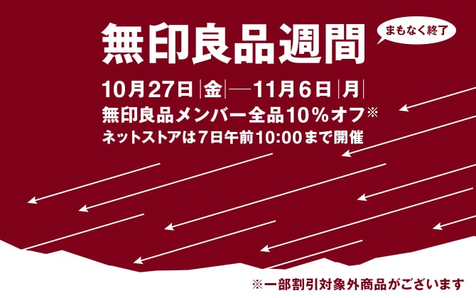 【まもなく終了】期間:2023年10月27日(金)~11月6日(月) ※ネットストアは11月7日(火)午前10時まで 無印良品メンバーのみなさんに感謝を届ける『無印良品週間』を開催中。期間中、店舗では MUJI passportの提示で10%オフ、ネットストアでのお買い物も10%オフです。 対象者:無印良品メンバー(MUJI Card会員・MUJI.netメンバー・MUJI passport会員・LINEライト会員) ※最終日はアクセス集中が予想されますので、ご購入予定のお客さまは、お早目の購入検討をお願いします。