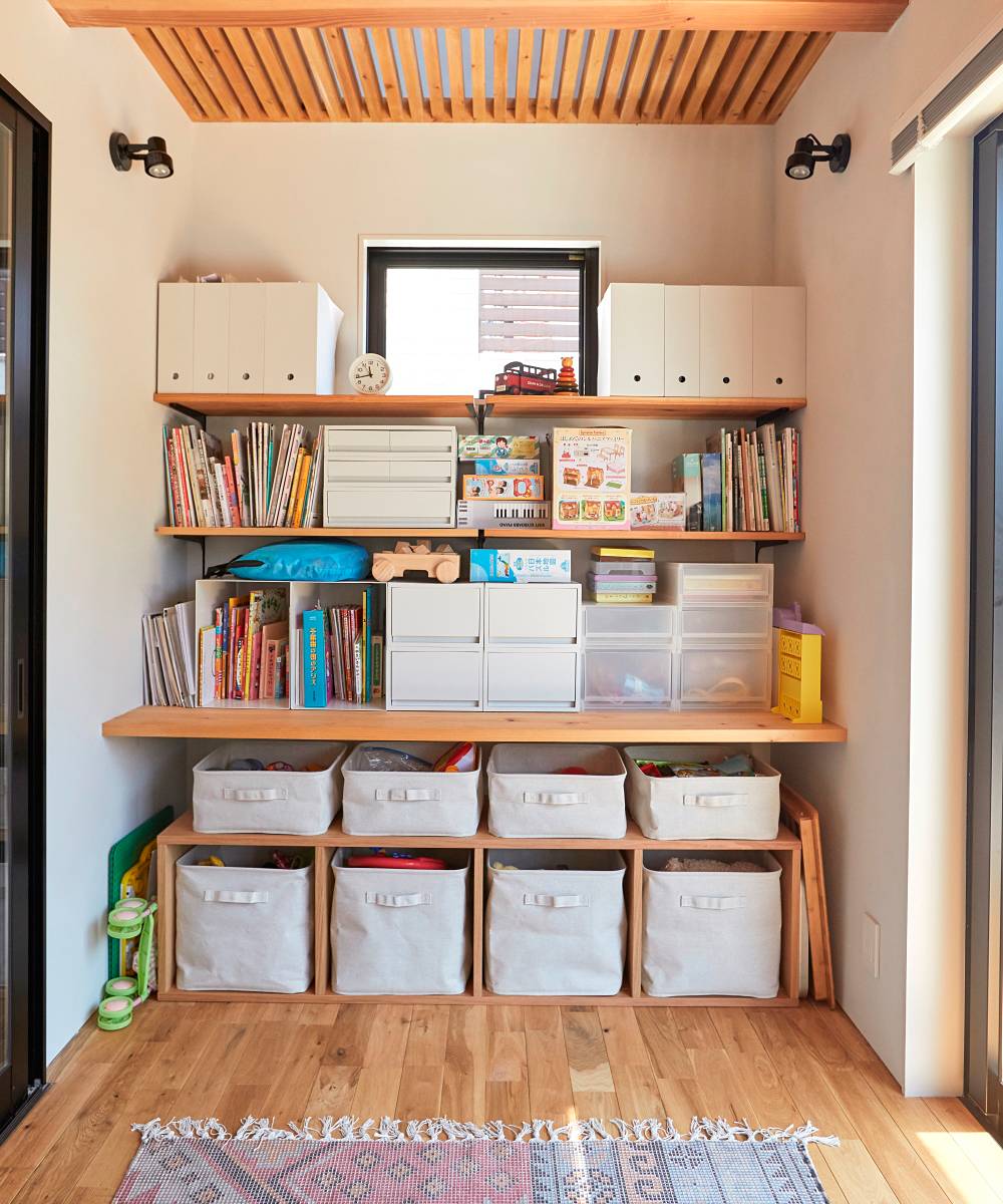 1Fのプレイルームのおもちゃをしまっている収納棚。将来はこども2人の学習机として使う予定です。