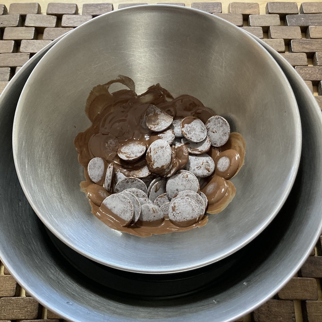 ボウルにチョコレートコーチングを入れ、チョコの中にお湯が入らないように、湯せん(約60℃)にかけます。