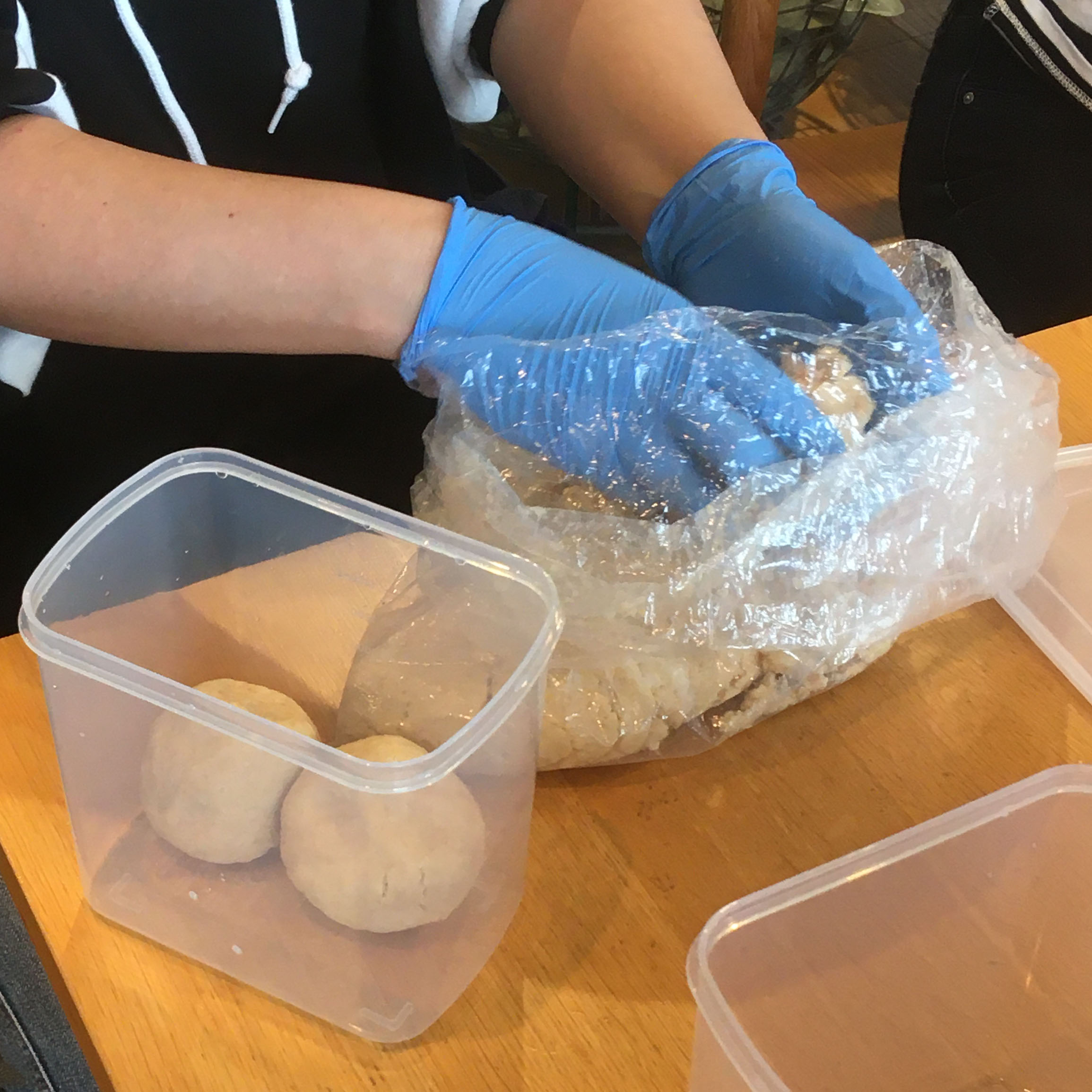 材料を混ぜ合わせ、しっかりと滑らかになるまで捏ねたら、容器に詰めていきます。
