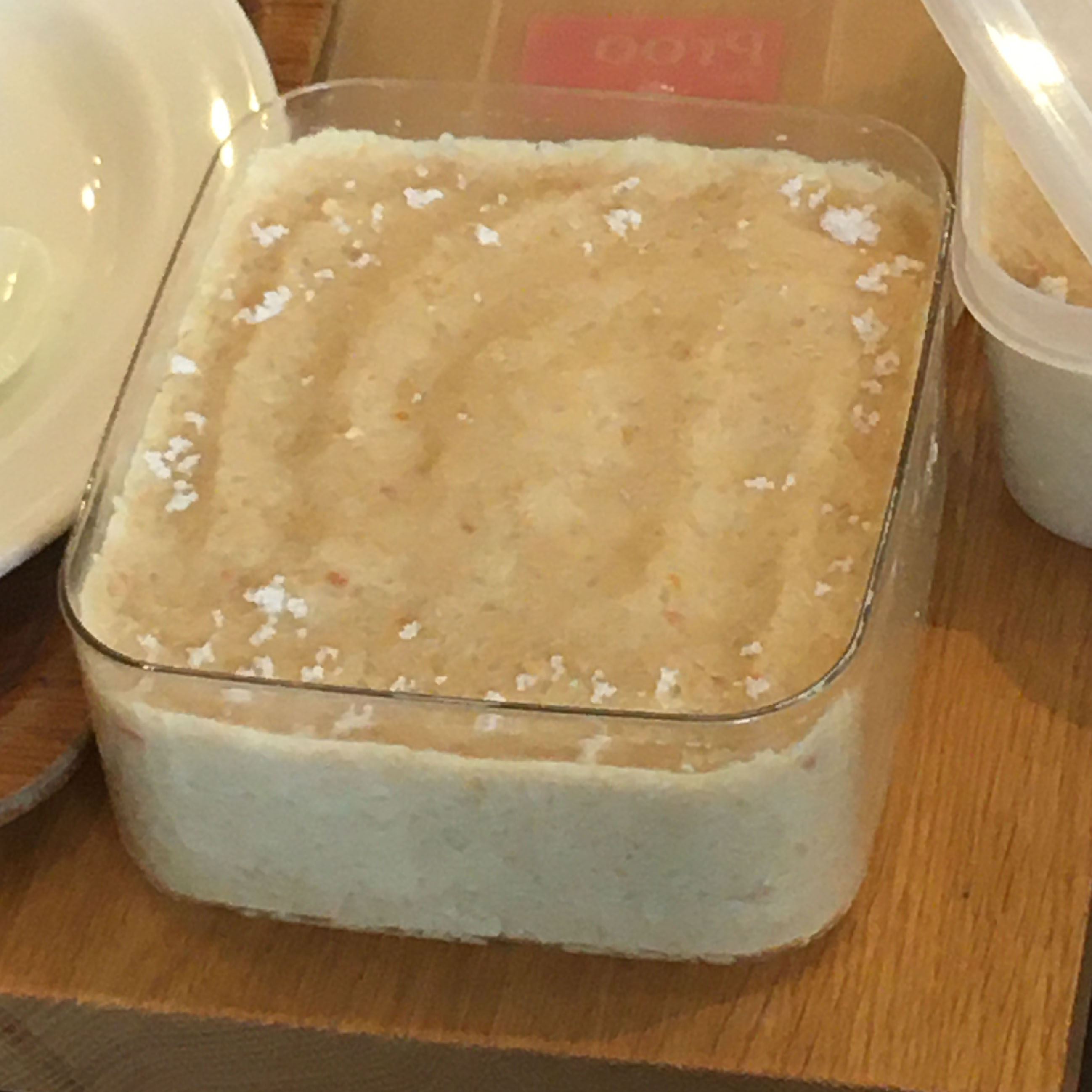 本日の教室で作るお味噌は、ご自宅にお持ち帰りいただいて、約三か月後からが食べごろです。