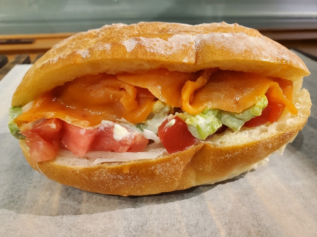 カットオニオンにからしマヨネーズを絡めたアボカドとトマトとサーモンをサンドしました。とても食べごたえがあります。