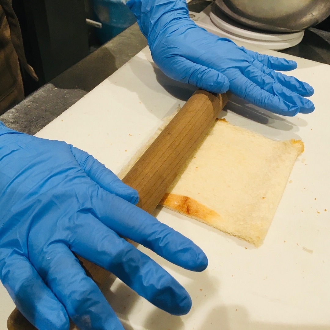 まずは食パンを軽くつぶします。