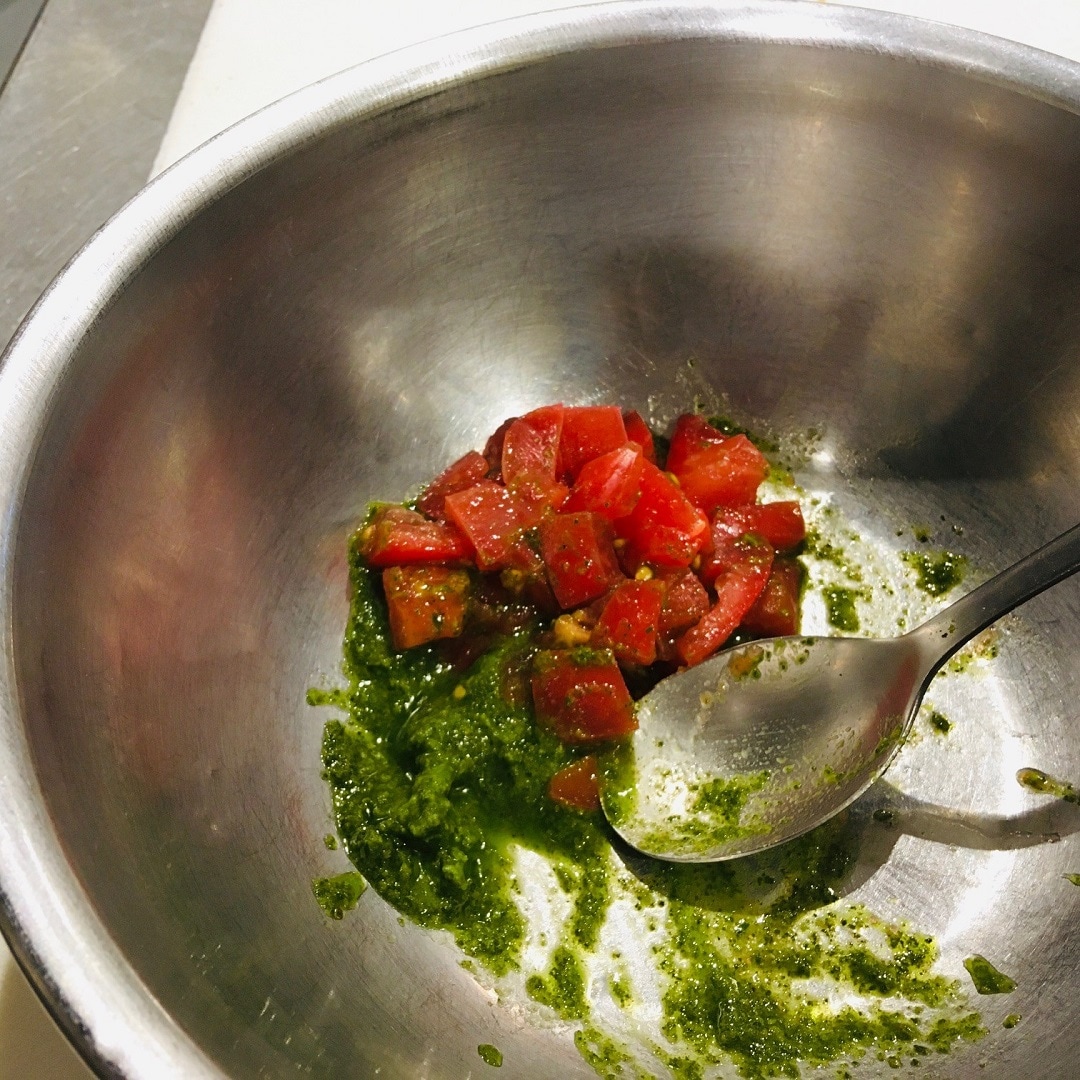 ここに、バジルソースと合わせたカットトマト、さらにチーズを乗せます。