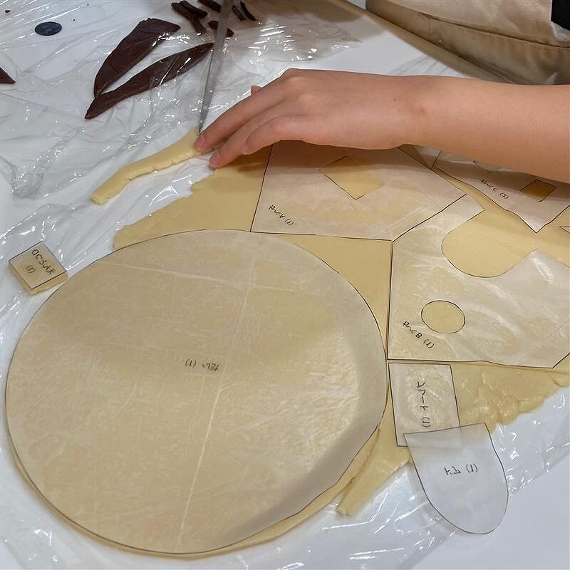 自分でクッキーを焼き、組み立てて「お菓子のいえ」をつくるキットです。ココアや抹茶で3色のクッキーがつくれます。
