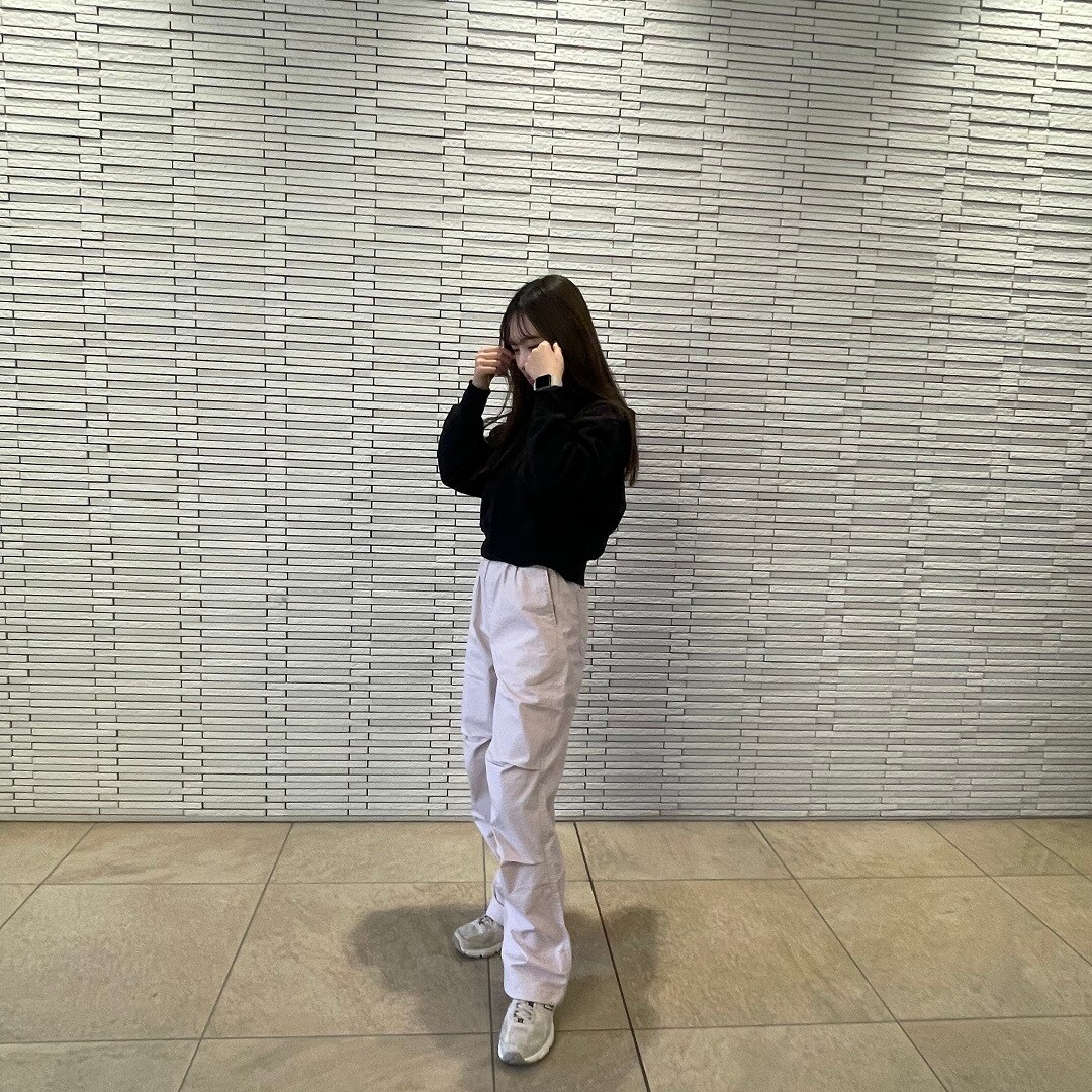 丈短めのパーカーを合わせることでスタイルアップ効果が期待できるコーデです。ライトピンクを取り入れることでスポーティー過ぎない印象になります。