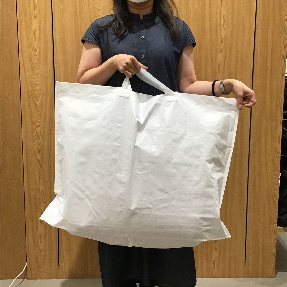 無印良品でも、まくらや大きな商品を購入いただいた際にお配りしていたポリ袋の代わりに、『再生ポリプロピレンバッグ』の販売をスタートいたしました。