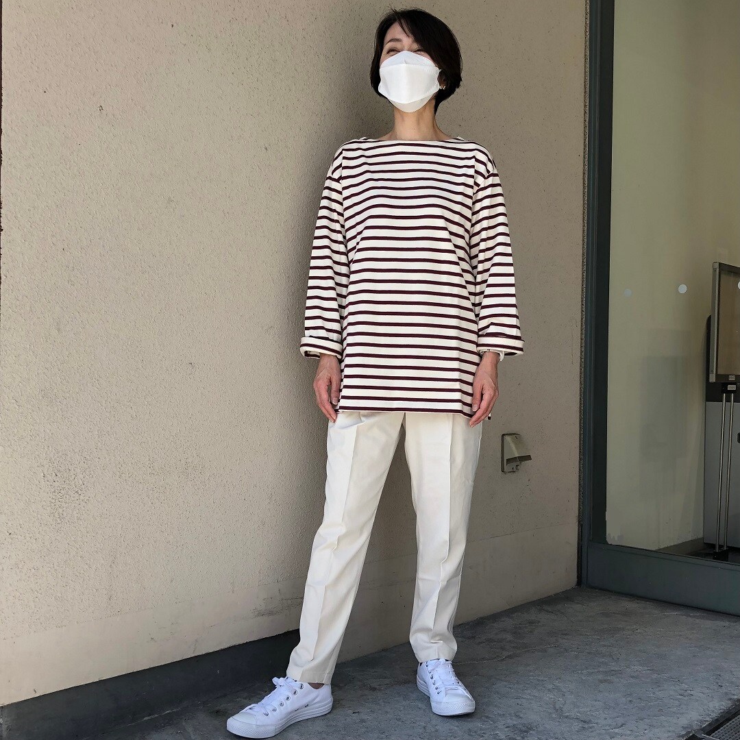 秋カラーのボートネック長袖Tシャツをゆったりサイズで着ました。