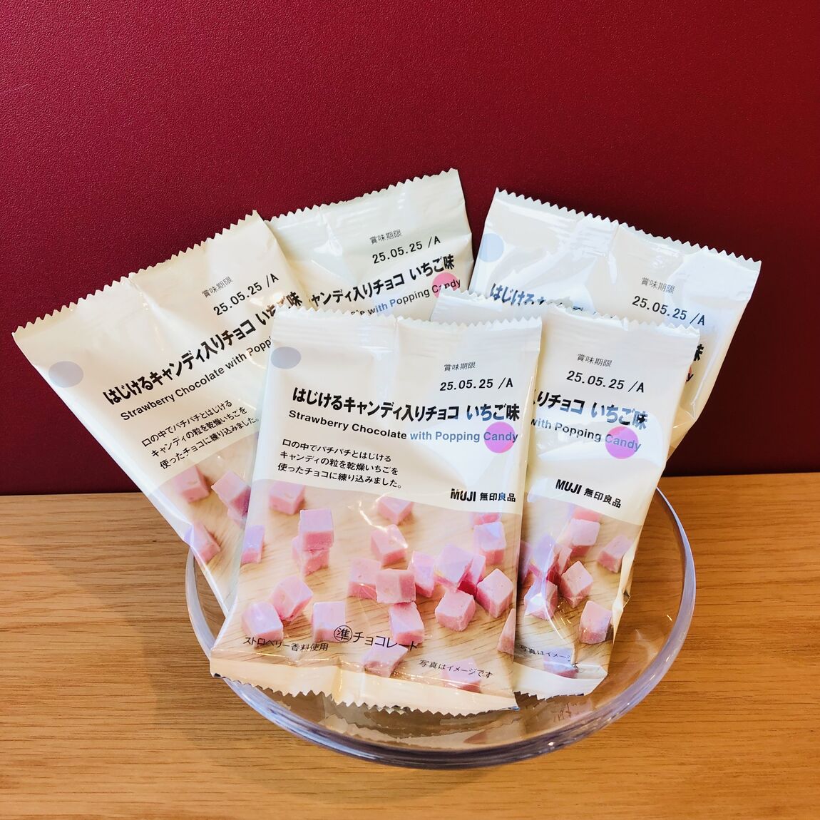 口の中でパチパチとはじけるキャンディの粒を乾燥いちごを使ったチョコに練りこみました。