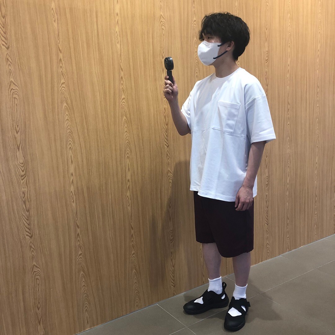 洗いざらしブロードイージーショートパンツ バーガンディ、涼感UVカットワイド半袖Tシャツ 白、充電式コンパクトハンディファン グレー、スニーカーサンダル