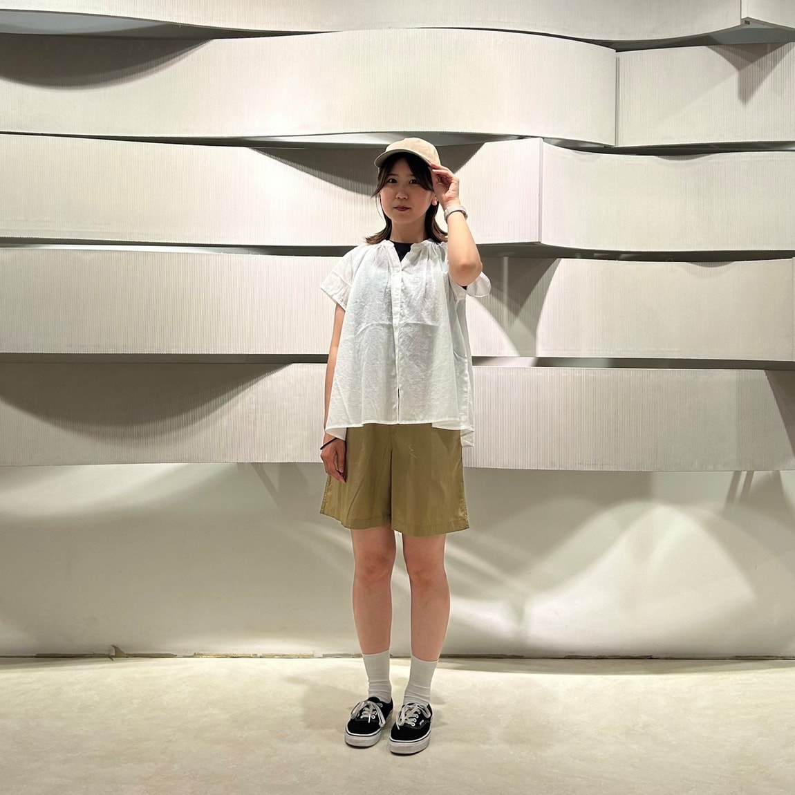 顔周りがすっきりと見える強燃ボイル生地のフレンチスリーブブラウスと今の時期にぴったりな履き心地のショートパンツを合わせました。