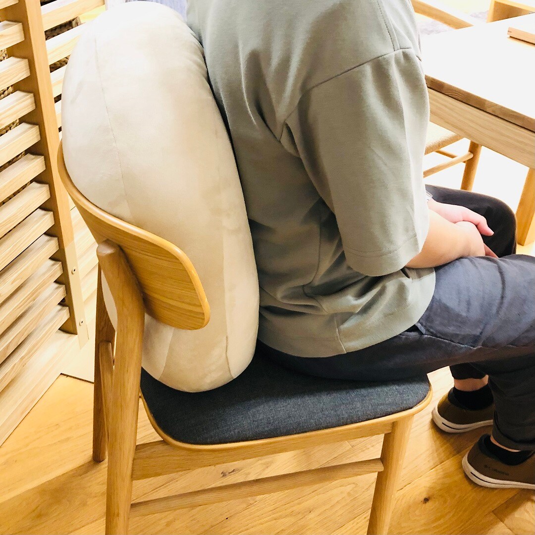 枕がわりにしたり、ももの上に置いて肘置きにしたり、椅子の背もたれに置いたりと、マルチに使っていただけるクッションです。