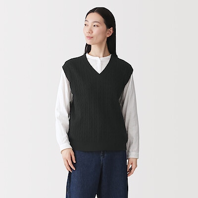 上に合わせたベストは、婦人「洗えるケーブル柄ベスト」のLサイズを着用しました。