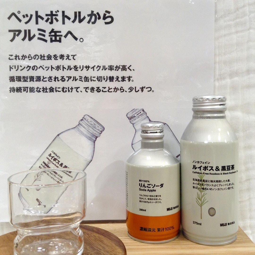 兼ねてから無印良品では、お茶やサイダーなどのドリンクを販売し、ご好評いただいておりましたが、この度、容器をペットボトルからアルミ缶に変更します。