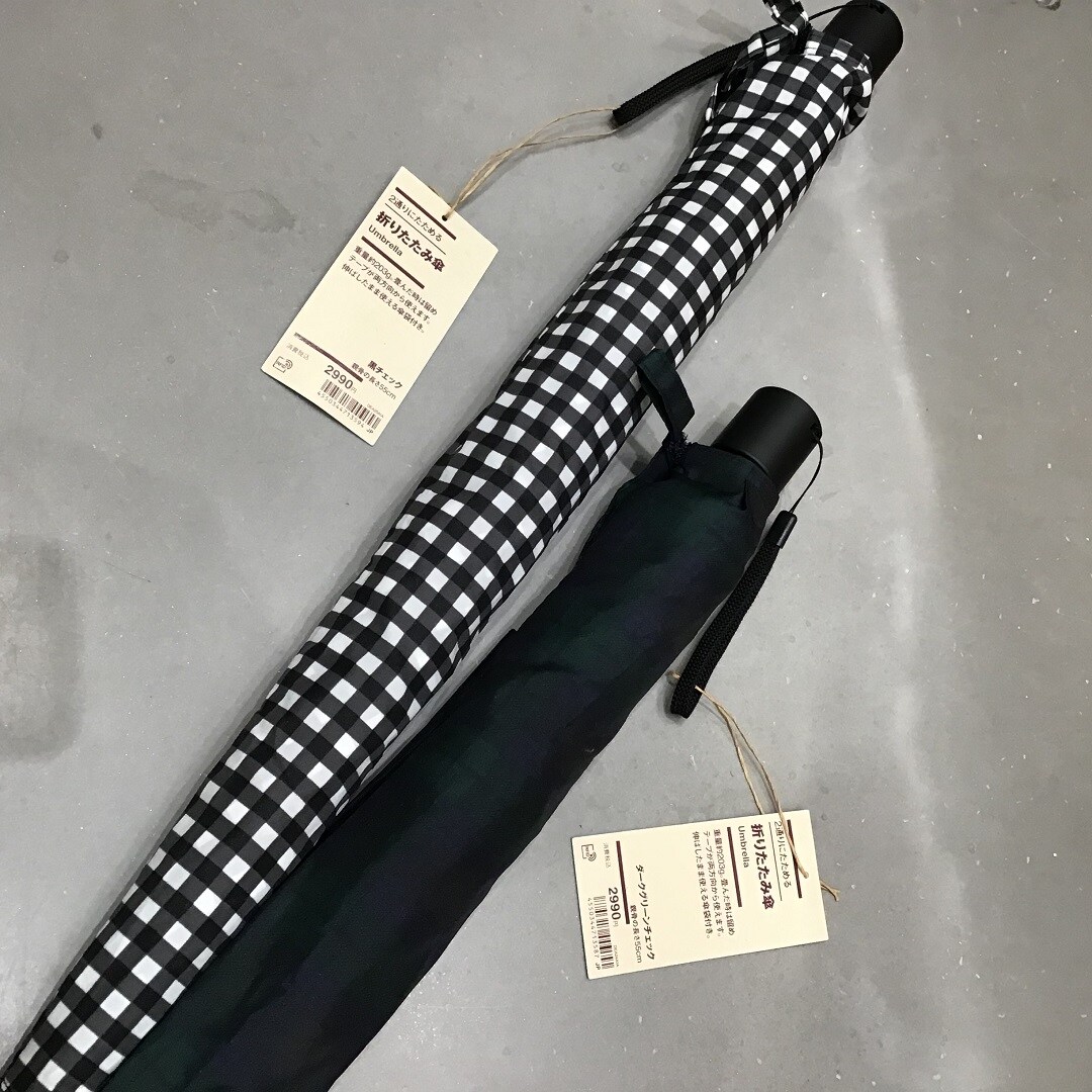 晴雨兼用 軽量 折りたたみ傘』税込価格1,490円。紫外線遮蔽率95%の生地使用で晴れた時も使えます。畳むと22.5cmと小さく161gと軽いのでバックの中に入れて持ち運ぶと、急な雨、紫外線にも便利です。マスタード、ダークレッド、ブルー、グレー、ネイビー柄、黒、ダークグリーンチェック、黒チェックの8色です。