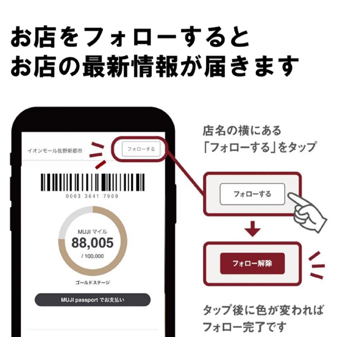 MUJI passportアプリでは、お店のフォローをすると新商品の情報や店舗の最新情報をチェックすることができます。