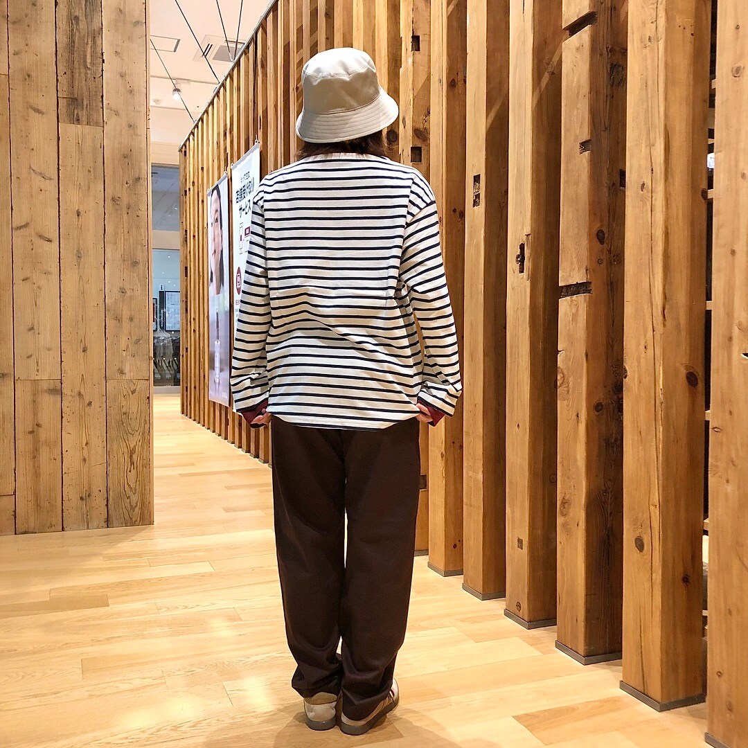 モデルのスタッフにはオフ白ボーダー色を着ていただきました。当店では全4色揃えております。サイズはS~XLを揃えておりますので、ぜひ店頭にてお試しください。