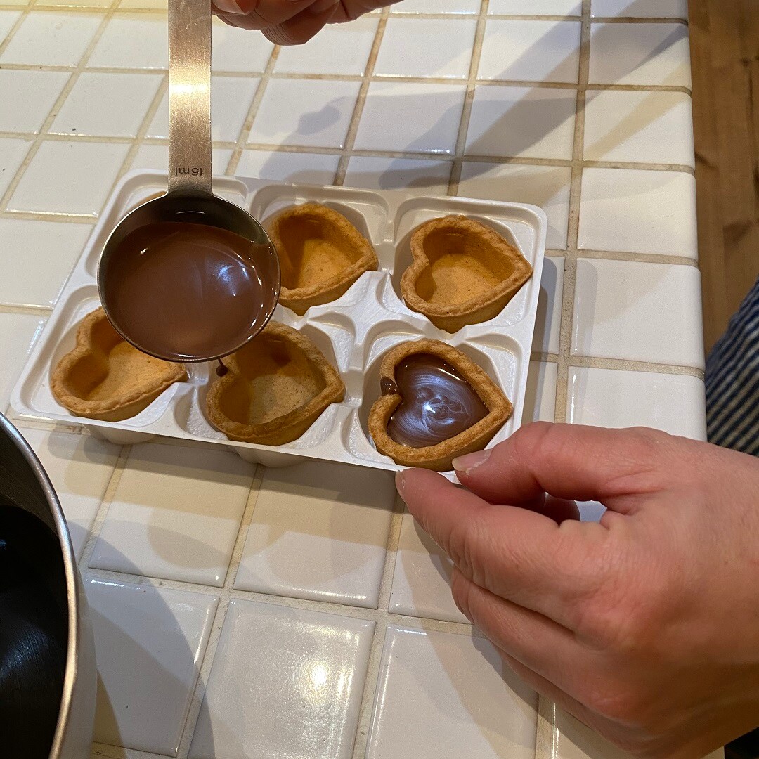 スプーンを使ってタルトに溶かしたチョコレートを流し入れます。