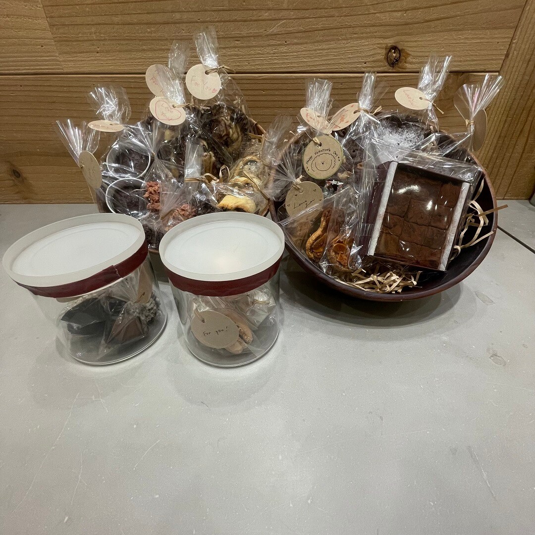 溶かしたチョコをタルトに流し込み、冷やし固めるだけでチョコタルトが手軽につくれるキットです。トッピング用のナッツとクランチをセットにしました。