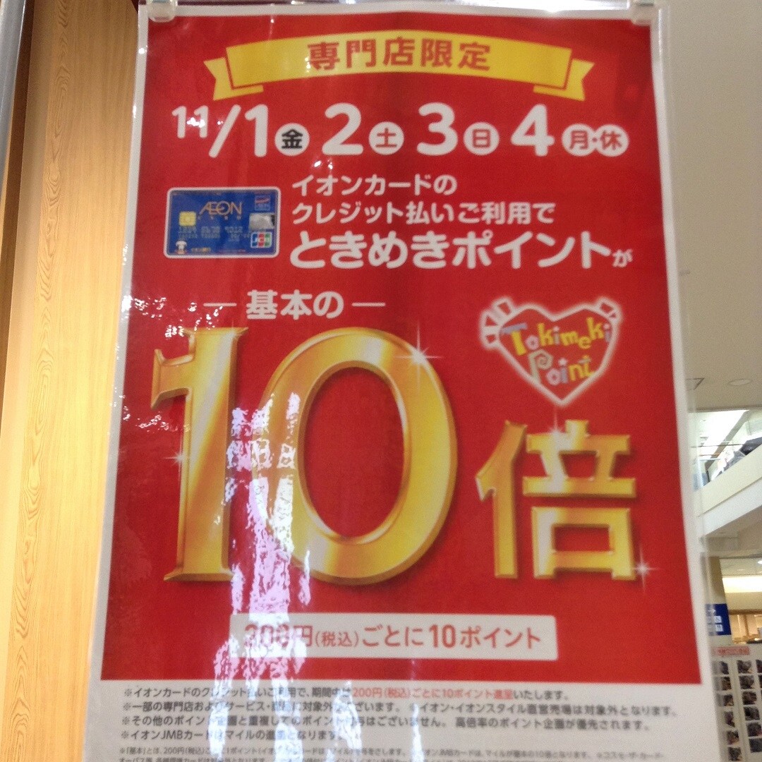 本日11月1日(金)より2日(土)・3日(日)・4日(月)の4日間、専門店でのお支払いの際、イオンマークのついたクレジットカードでクレジット払いをすると、200円(税込)ごとに10ポイント進呈します。