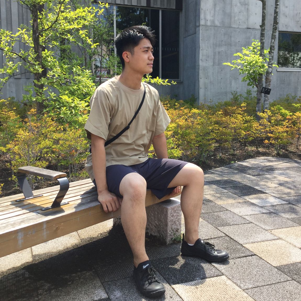 こちらは『インド綿洗いざらし布帛Tシャツ』と『UVカット強撚ショートパンツ』のコーディネートです。