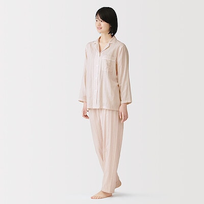 婦人 脇に縫い目のない 二重ガーゼ長袖パジャマ 婦人S・ベビーピンクストライプ