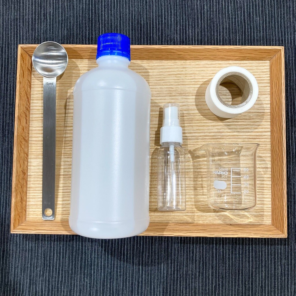 ① 無水エタノールを計量し、ボトルに入れます。