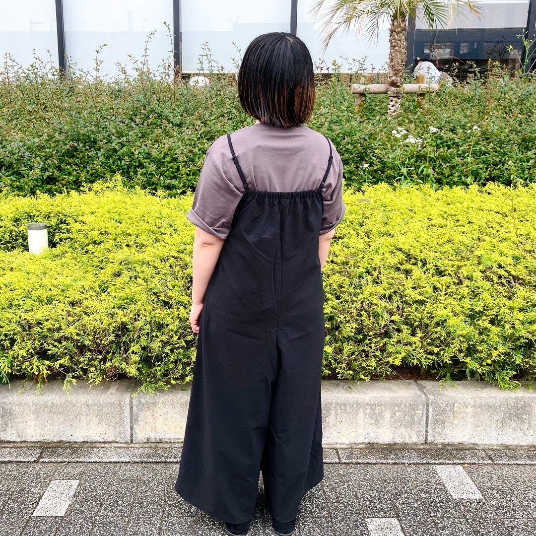 ワイドシルエットのTシャツは袖をロールアップし、サロペットはワンサイズ下げることで、すっきり見えるようにしました。