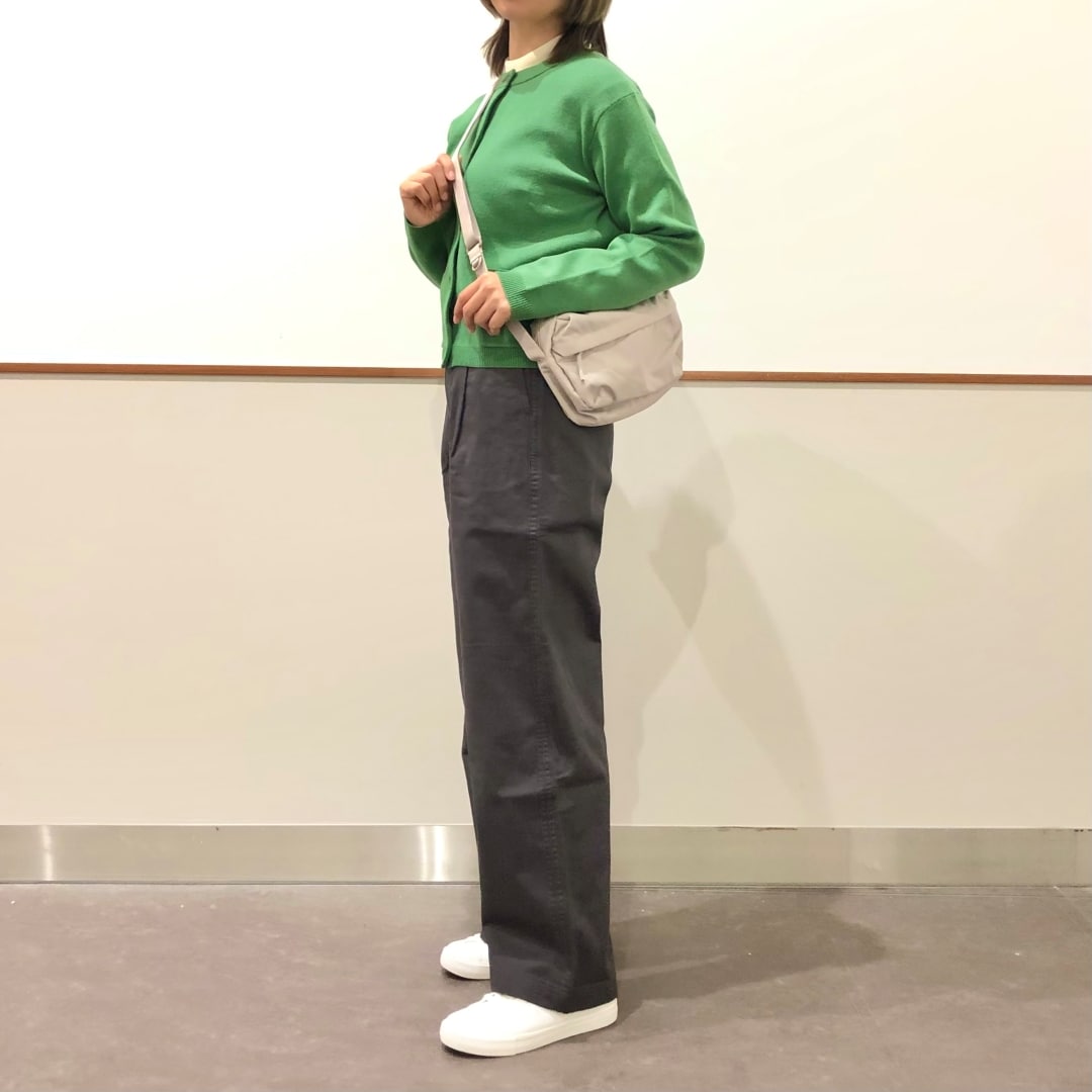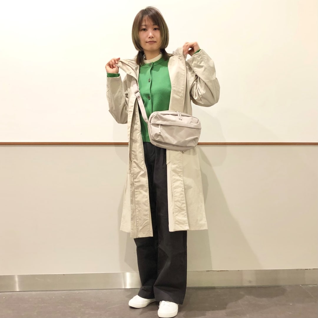 機能性抜群のフード付きコートと、ぱっと華やぐ色合いのカーディガンを取り入れたコーディネート。