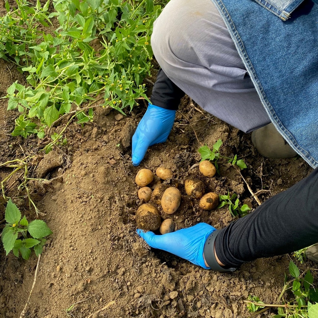 ふかふかの土の中に手を入れて、手を前後に動かすと、中からおいもが出てきました。