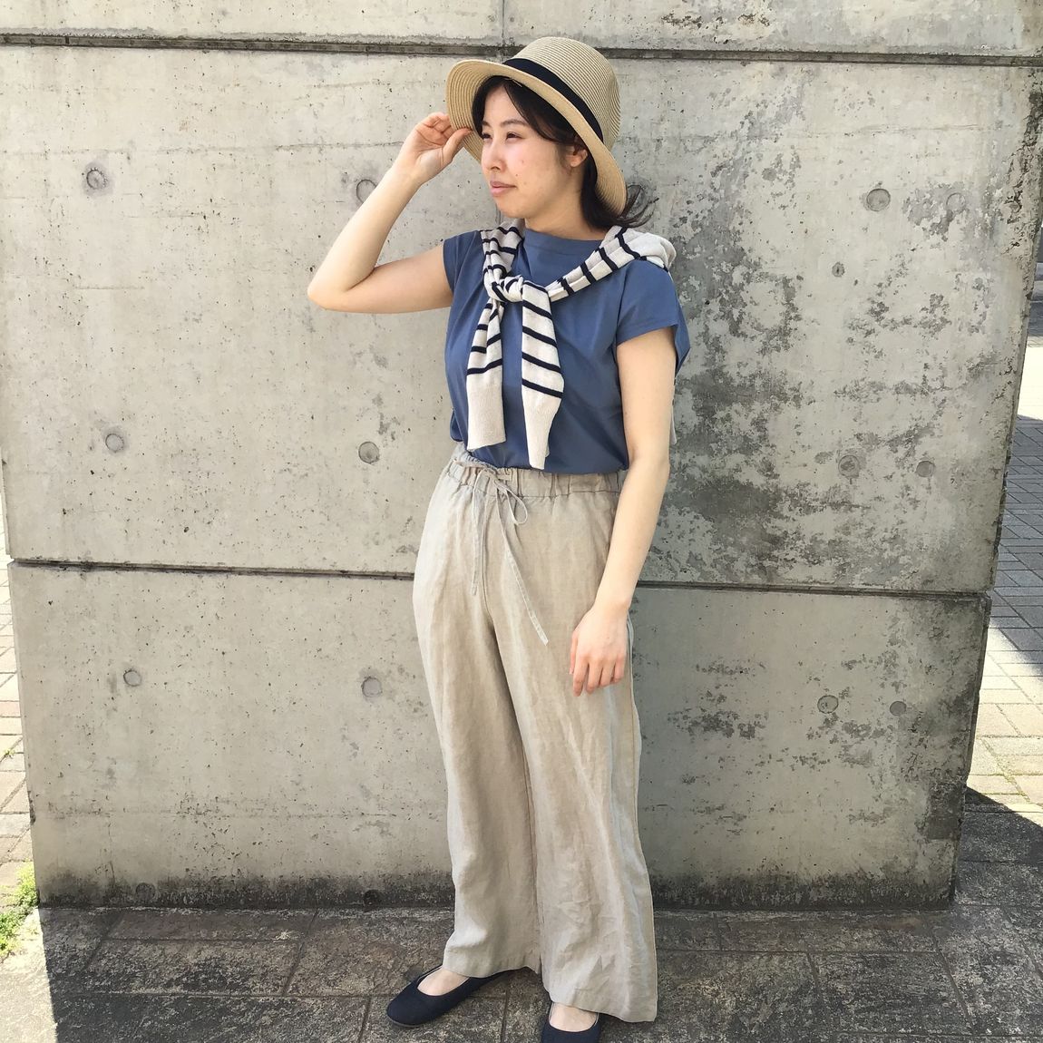 さわやかな夏を感じさせるブルーのTシャツにシンプルなリネンのパンツを合わせました。