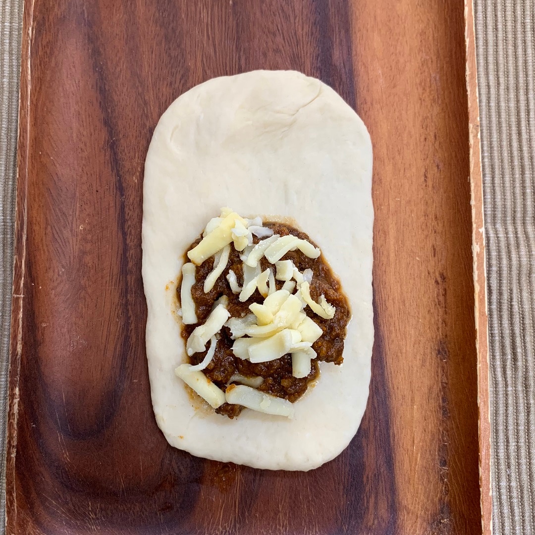 ④生地のうえに、『素材を生かしたカレー ジンジャードライキーマ』、お好みでとけるチーズをのせて包みます。端をフォークでしっかりおさえると、焼くときに中の具が出にくいです。