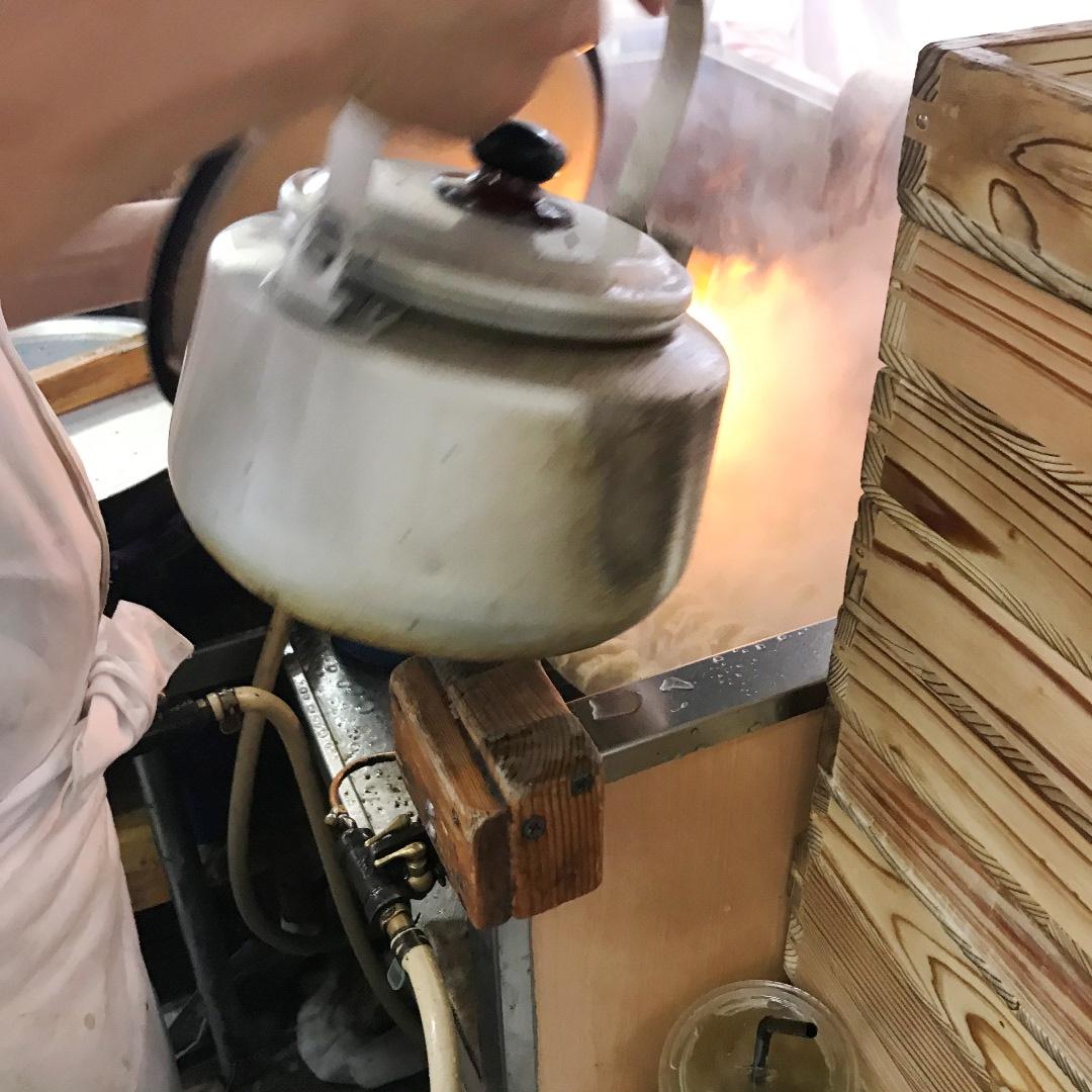 食べている間も、絶え間なく餃子が焼かれています。やかんの水を投入して、さらに蒸気が上がります。