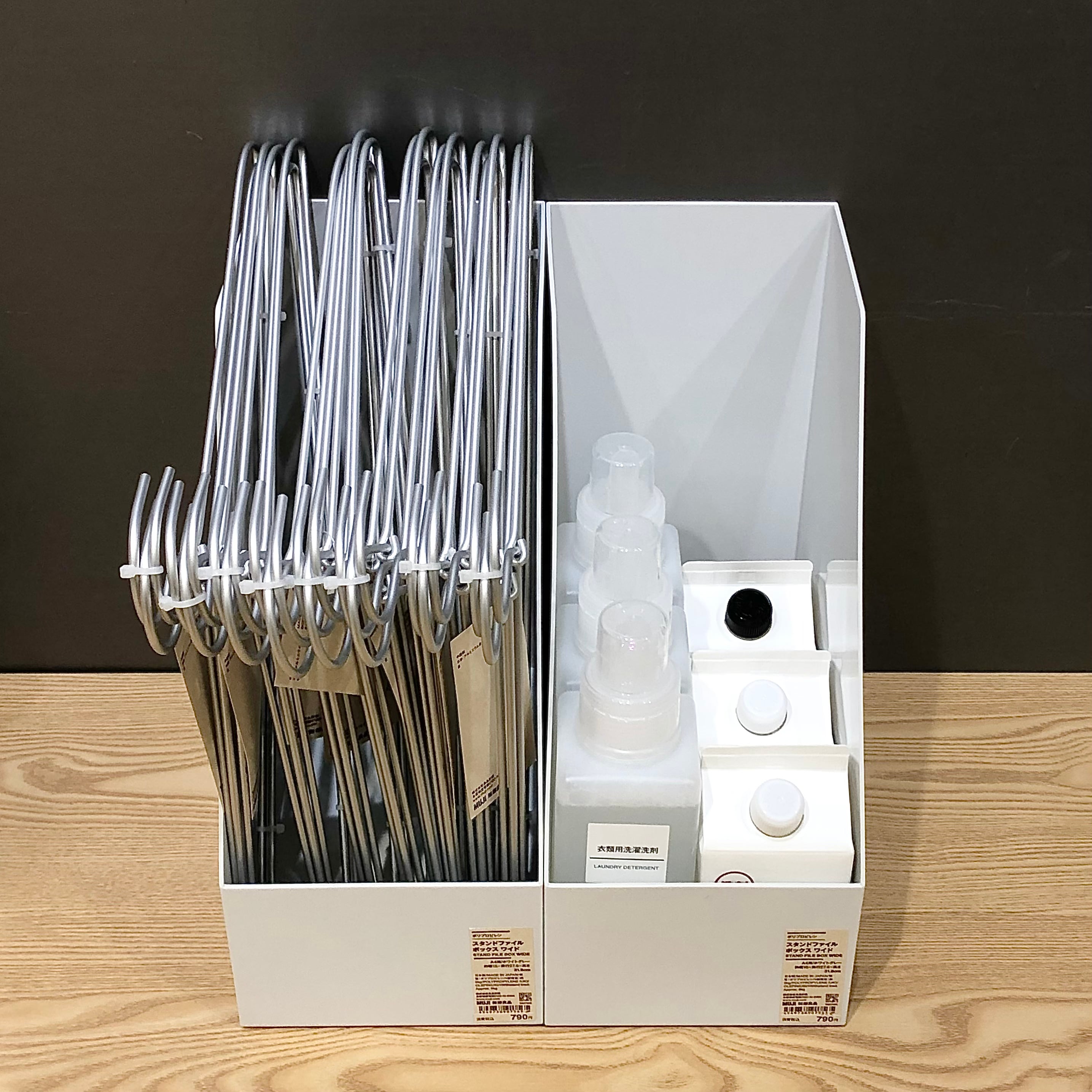 洗濯室などのランドリー用品をしまうことも可能なファイルボックス。ハンガーを縦に収納する事で、取り出しやすく収納できます。