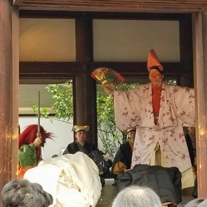 神楽殿では、茂山千五郎社中による福の神が鬼を払う「北野追儺(ついな)狂言」、そして上七軒の舞妓・芸妓による日本舞踊が奉納され、最後に豆まきが行なわれました。