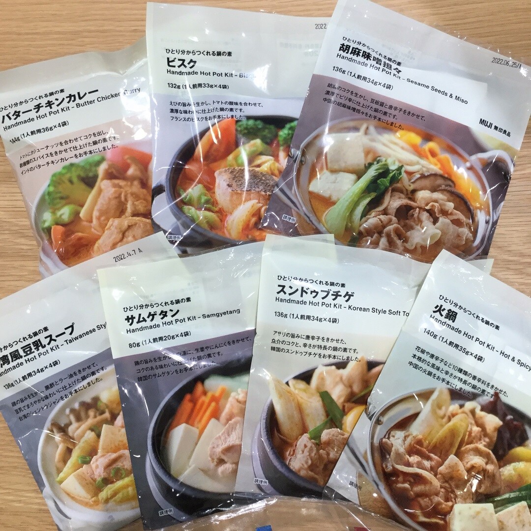 こんにちは。いつも無印良品エアポートウォーク名古屋にご来店ありがとうございます。 寒さも一段とと厳しくなってきて、あたたかい食べ物がさらに恋しくなってきましたね。 今回は、わたしはもちろん、スタッフも何度もリピートしている、 ただいま価格施策中の『ひとり分からつくれる鍋の素』のシリーズを紹介いたします。 お伝えしたいことが沢山あるのですが、まずは味の種類からお伝えしますね。 種類は全部で7種類。