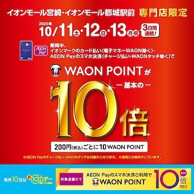 【イオンモール都城駅前】本日最終日 専門店限定!WAON POINT10倍のお得なキャンペーン開催中!