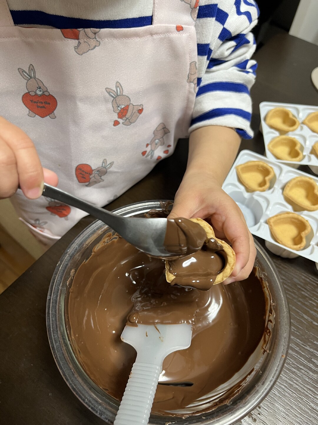 3歳のむすめと一緒に作りましたが、チョコをタルトに入れるところとトッピングはむすめがしました。