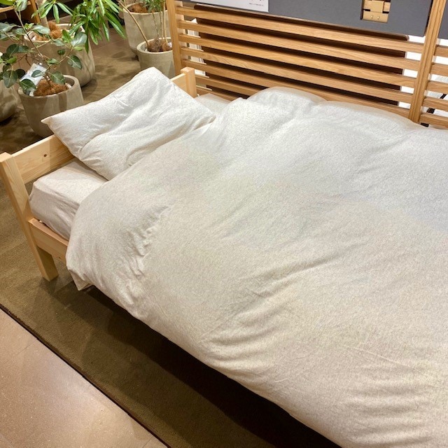 パイン材の明るい色のベッドフレームとカバーの杢ライトベージュの色味が相まってやわらかい印象に仕上がりました。